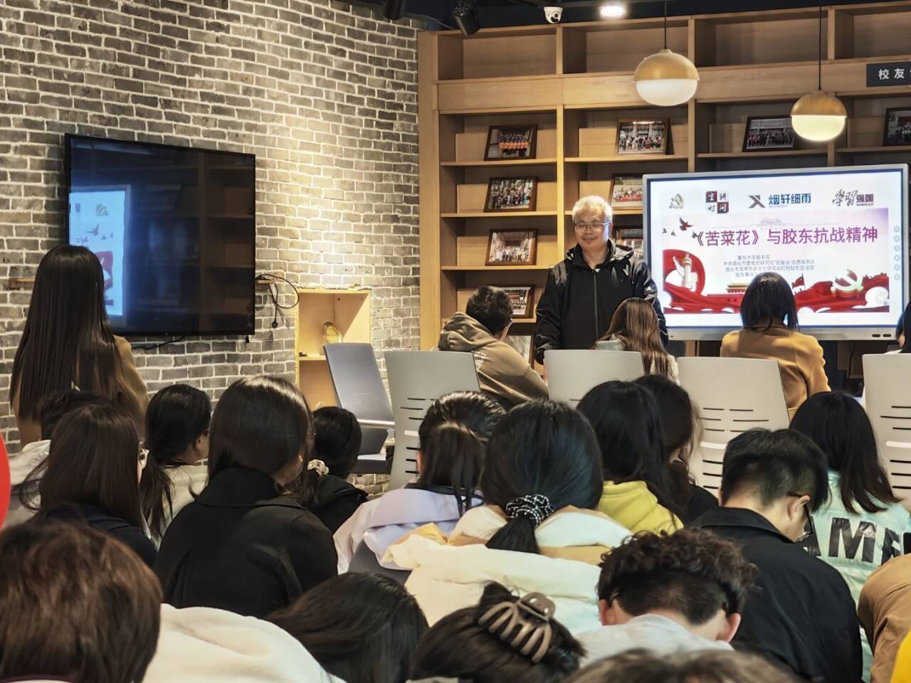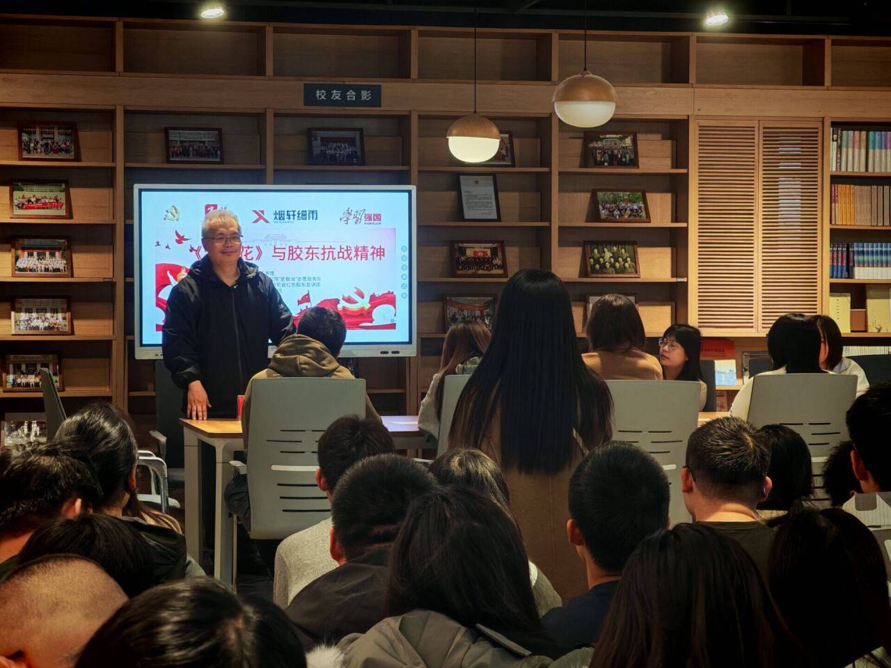 在互动环节,同学们积极提问,就胶东精神传承与当代价值等方面与周老师进行深入交流。周老师总结指出,文学作品体现史学价值,在阅读中坚持文史融合,方能找到历史研究的新角度。活动最后,周老师带领同学们一同观看了“胶东抗战小说暨《苦菜花》版本展”。