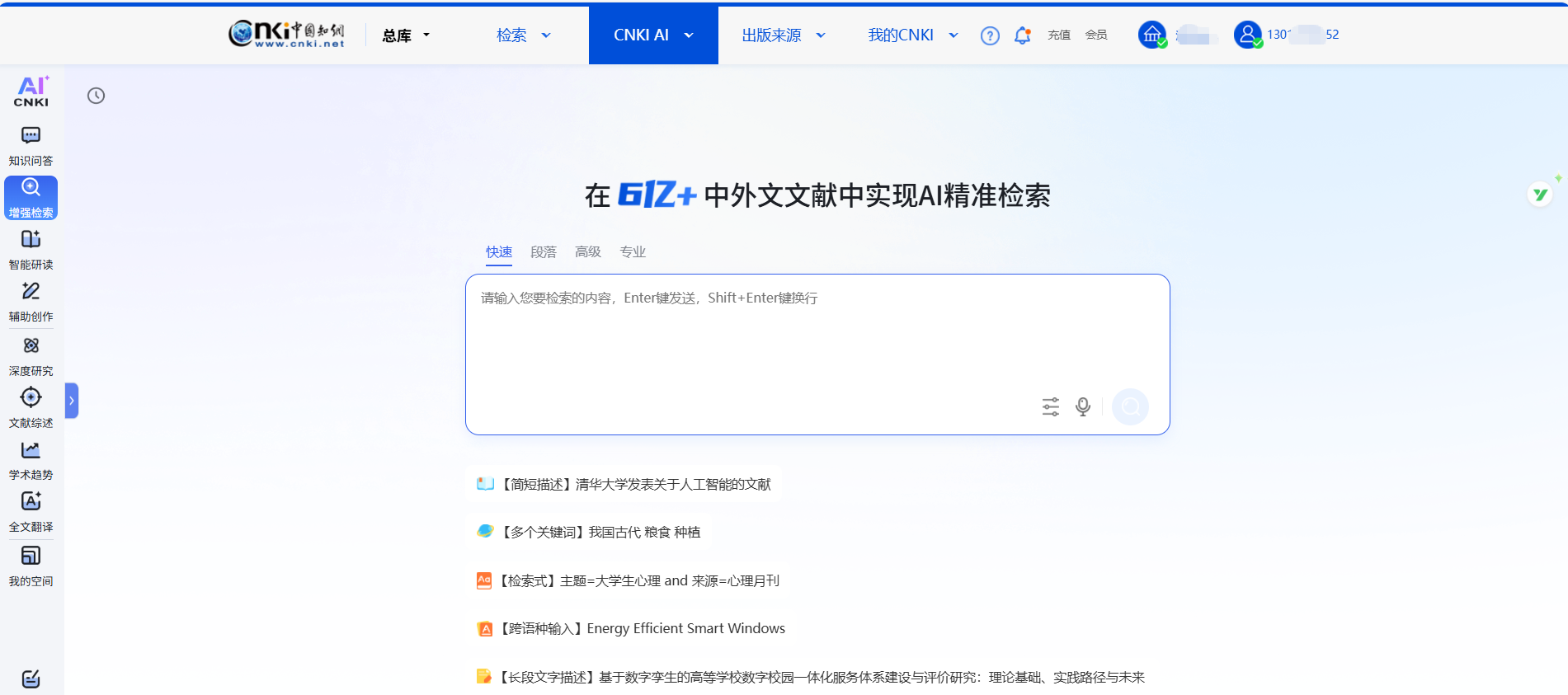 产品简介:CNKI AI是人工智能时代同方知网研发的服务于科研全流程的AI辅助研究工具。CNKI AI将先进的华知大模型、DeepSeek及知网高质量文献与科研场景紧密结合,围绕前沿探索、文献研读、成果创作与知识管理等核心需求,构建了AI增强检索、AI知识问答、AI辅助创作、AI文献综述、学术趋势、全文翻译等体系,提供面向学习与科研的全流程、场景化服务,大幅提升研究效率与质量,全方位助力科学研究与科技创新。
