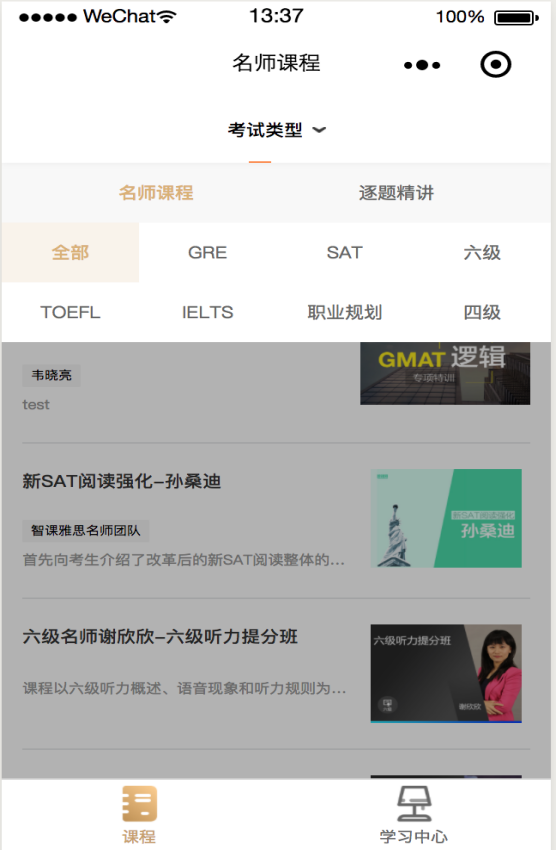 B. 点击考试类型,可以选择名师课程和逐题精讲的各个类型