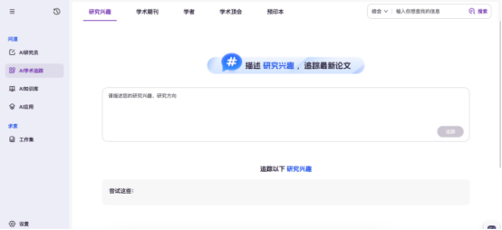 输入研究兴趣内容,闻道科学导航根据输入自动生成和推荐相关研究兴趣,点击“追踪”,即可追踪最新文章。
