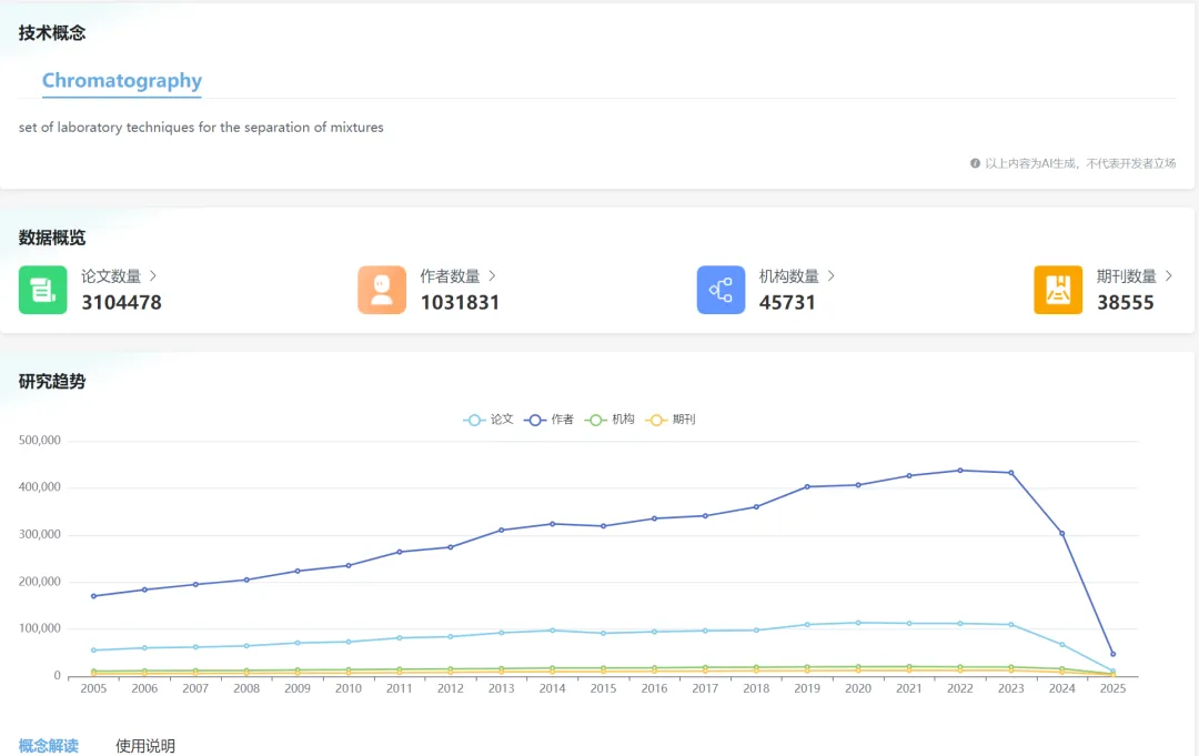 技术概念趋势分析:追踪领域内关键概念、术语的演变轨迹,揭示发展规律、热点变化和未来走向,精准识别创新方向,为选题、学术合作提供专业参考;