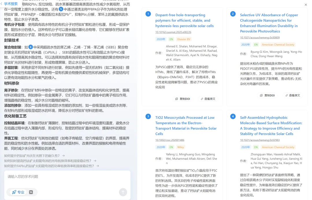 AI学术搜索:基于外文学术资源垂直领域研发的专属 AI 搜索引擎,训练数据和检索结果均来自专业学术文献,告别通用搜索的无效信息:输入研究问题即可进行自然语言检索,支持多轮问答,系统会精准提炼相关度最高的文献,还会附上每个知识点的出处链接,一键溯源原文,让你告别无效搜索,快速找到核心文献。