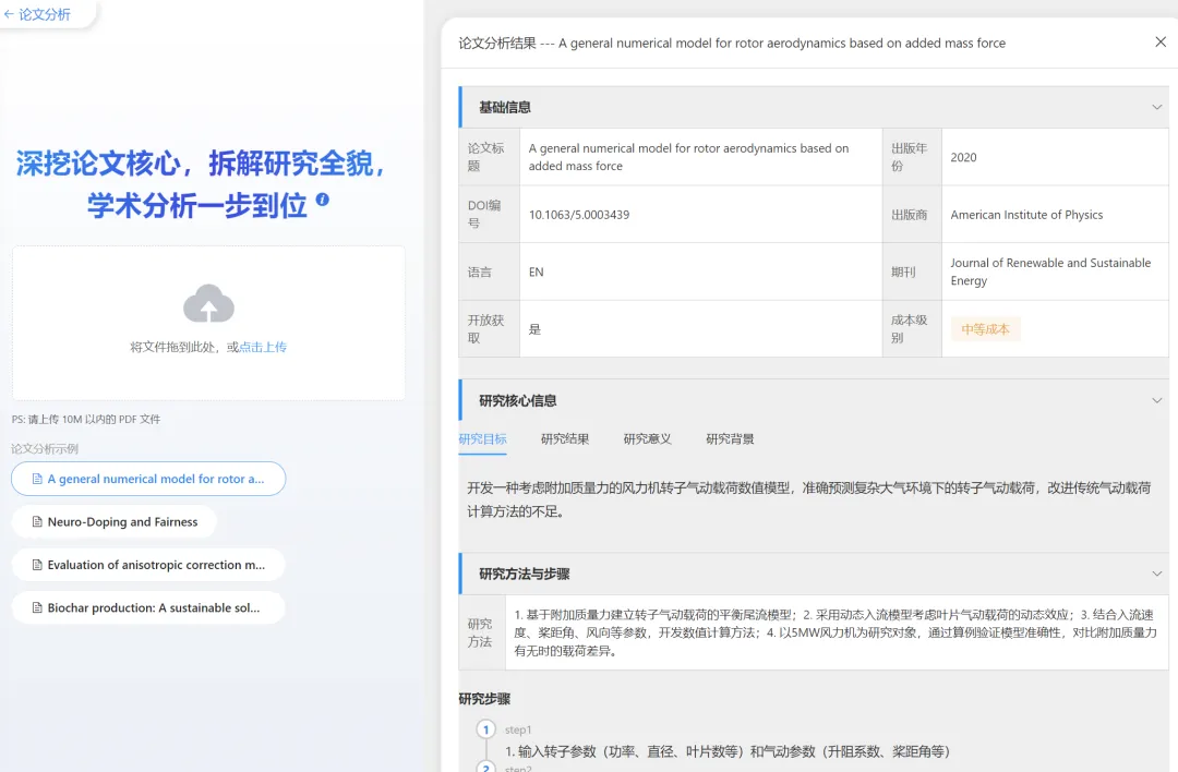 单篇文献智能解析:上传数据库文献或个人下载的外文文献,系统自动提取研究目标、方法步骤、研究结果、创新点、局限性、未来研究方向等核心要点,几分钟就能读懂一篇外文文献,快速抓住文献核心;