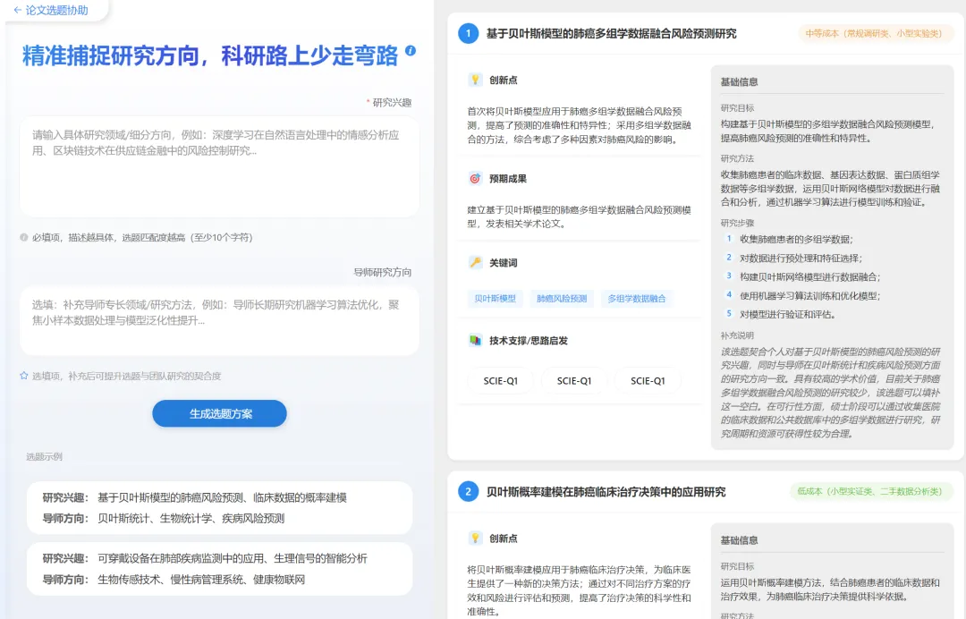 智能论文选题协助:输入研究领域 + 导师专长方向,系统自动生成结构化选题方案,包含创新点、研究目标 / 方法 / 步骤、预期成果、核心关键词、技术支撑等关键要素,精准贴合导师研究方向,帮你定位优质选题,告别科研内耗。
